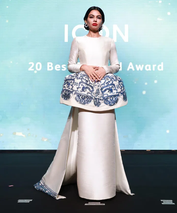 Lawyer Shabnam Arashan exuded the coolness and elegance of a Ming vase with this finely embroidered blue-and-white gown from Tiiya’s Spring/Summer 2021 collection, which is inspired by Chinese pottery. For the uninitiated, Tiiya is Qatar’s first haute couture brand, founded by Qatari royalty and mother-and-daughter design duo Shaikha Alanoud Alattiya and Shaikha Shaikha Al-Thani.