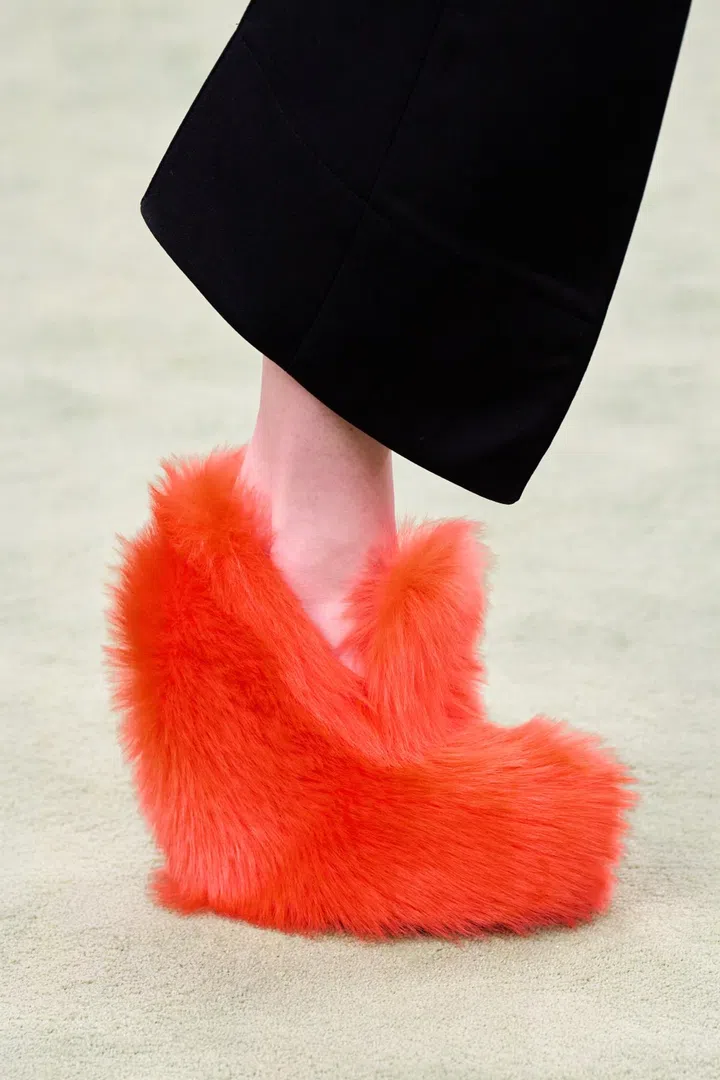 The subtle C curve also extends to accessories such as the platform pumps – of which the fiery orange fur design will surely be one of the strongest contenders for fun shoes of the season.