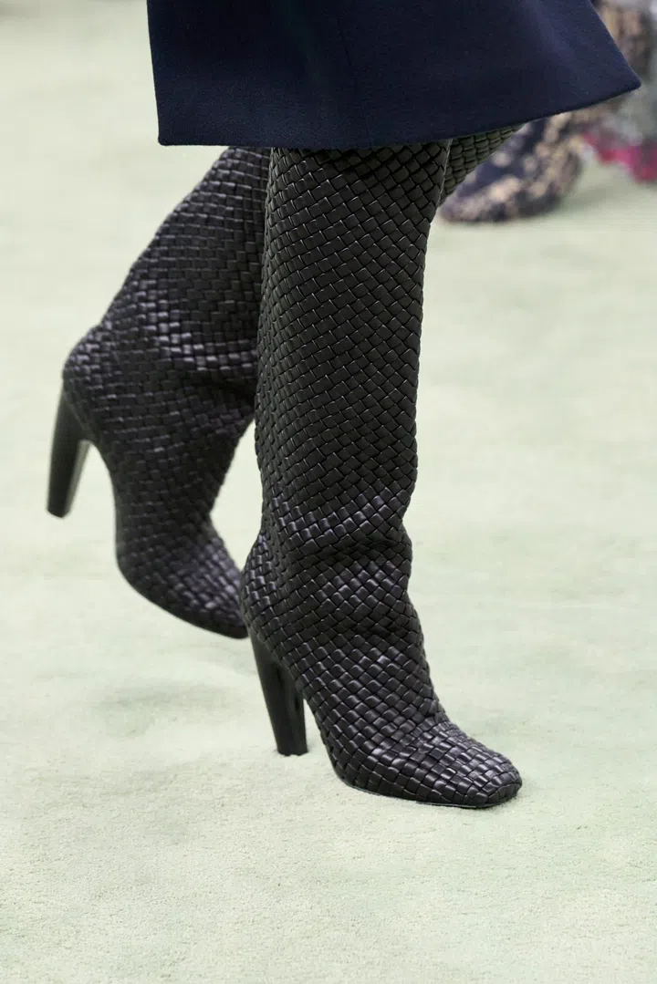 In recent years, Bottega Veneta's classic intrecciato weave has sort of taken a backseat to the new bags introduced by Daniel Lee, who played up and oversized the woven motif through accessories such as the wildly popular Cassette bag. For Fall/Winter 2022, however, Blazy re-focused on the classic weave and introduced it into new categories such as these knee-high boots and even a pencil skirt. Again, all handwoven without the use of stitching.