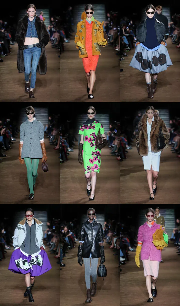 Miu Miu Fall Winter 2024 features exuberant renditions of wardrobe staples from across eras and stages in life – from child-like shrunken cardigans to womanly’ 40s-style sheaths to 2000s-chic low-slung, skinny-fit jeans – evoking questions about history, memory and how we keep them alive.