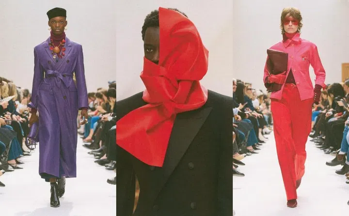 Even in a collection rooted in blacks, whites, and creams, Rider knows how to wake up the eye. Cyclamen-pink shirts, lipstick-red trousers, bright flares, and carefully placed sequins punctuate the streamlined silhouettes like tiny shocks of joy.
