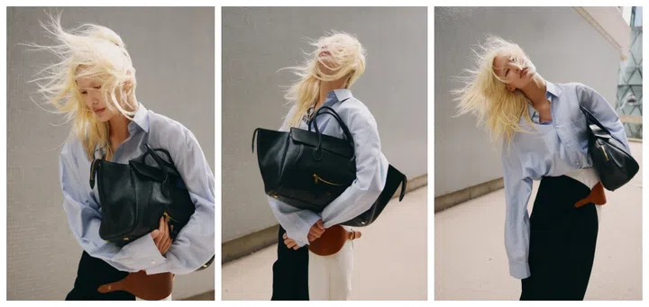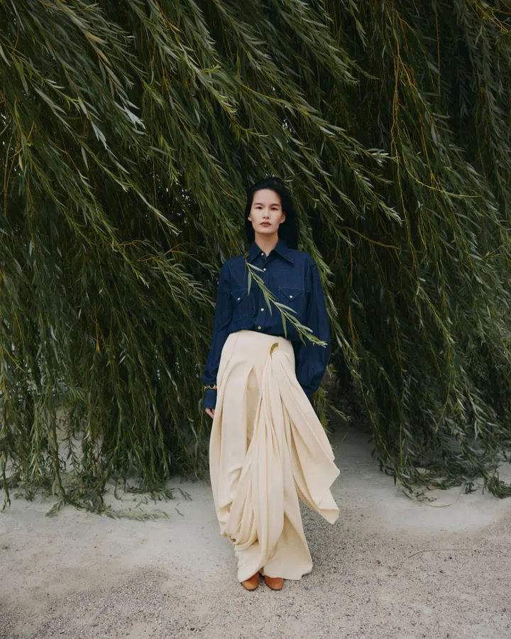 The tailoring: oversized and cut French-style, easy to throw on and go. What to wear them with: boyfriend jeans, skinny jeans, billowing patchwork skirts – mix and match as you like. The accessories: slender leather lace-ups, stackable statement rings, and the buoyant refresh of the 2010s-born Luggage tote, now with a curved zipper that brings to mind a smiley face. It’s time to kick back as Michael Rider’s debut Celine collection makes everyday dressing a joy.