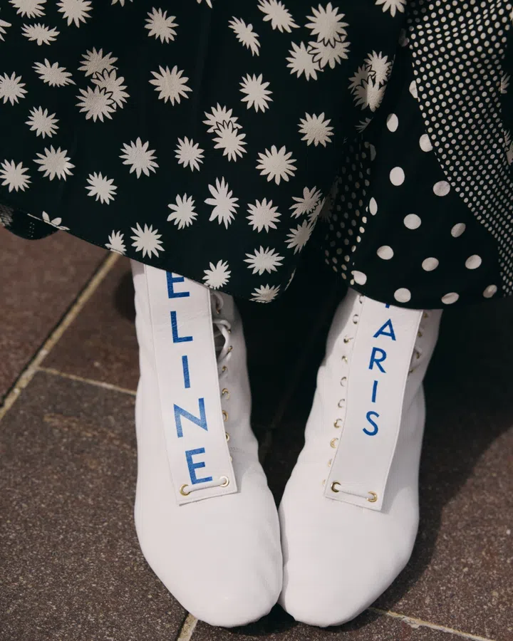 Both looks: Viscose dress, cotton pointelle socks and lambskin lace‑up ballet shoes, Celine
