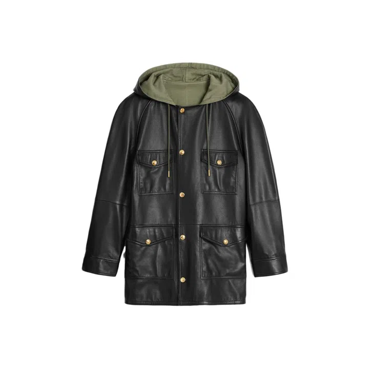 Keeping true to the rock roots of this collection, this parka comes in a sleek lambskin finish and shiny gold buttons.