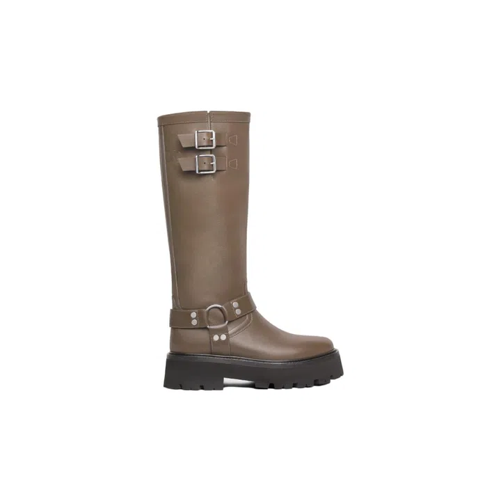 Add a touch of tough punk attitude to your getup with this chunky soled boots which featured biker-inflected touches such as the heel strap and buckles.