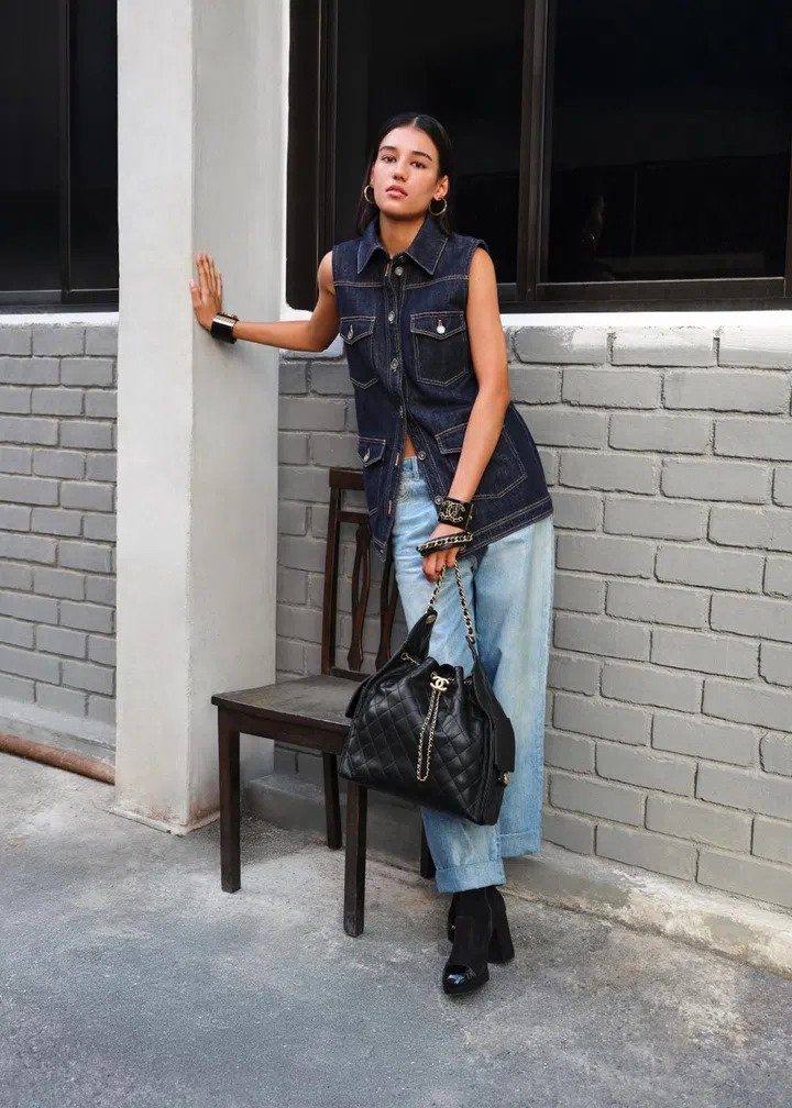 On Charleigh: Chanel 25 medium calfskin handbag with metal clasp, and leather and metal chain shoulder strap; denim vest with jewelled buttons; coated denim jeans with a jewelled button; metal and strass earrings; resin cuffs with metal and leather (sold separately); and suede and patent calfskin boots, Chanel