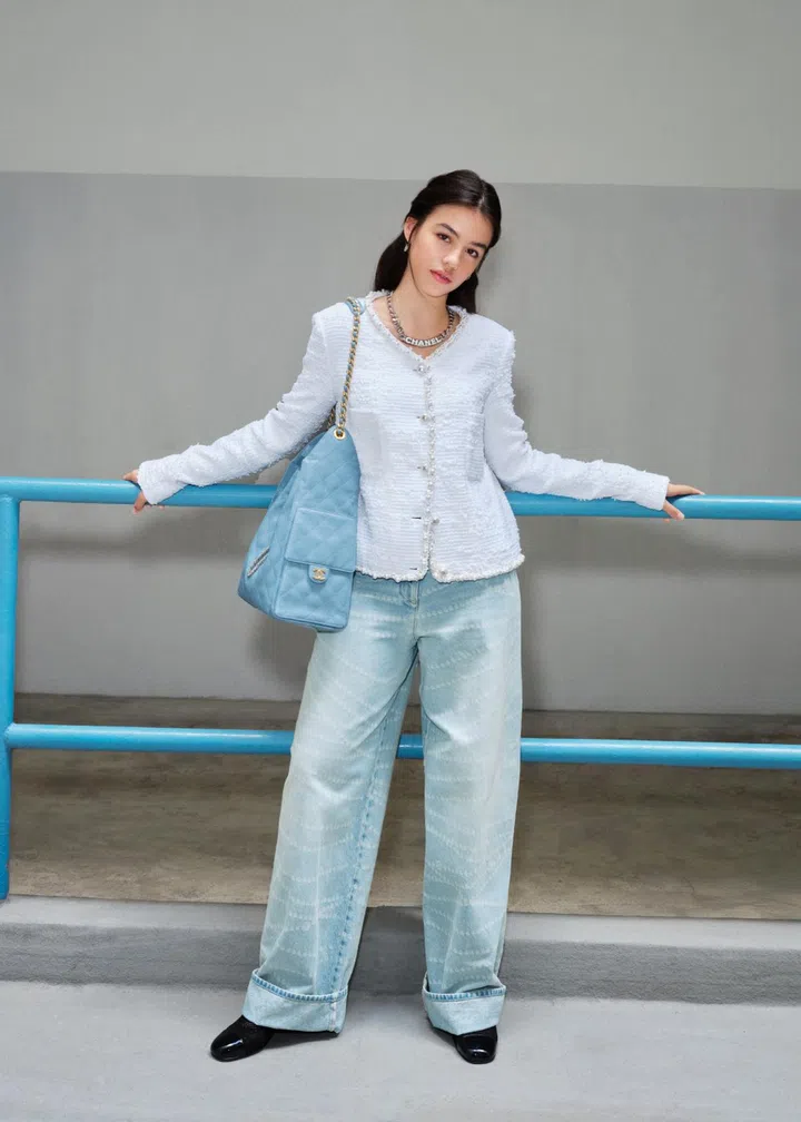 On Mila: Chanel 25 medium calfskin handbag with metal clasp, and leather and metal chain shoulder strap; cotton tweed jacket with beaded braid trim and jewelled buttons; denim jeans with a jewelled button; metal earring with strass (sold in a pair); metal and resin necklace; and patent leather and mesh boots, Chanel