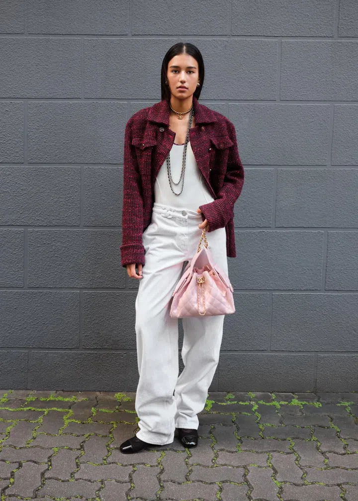 Pull it to the end of the chain drawstring to open the bag to its maximum, then fasten it back to safely secure its contents – a functional design that makes the Chanel 25 perfect for travel and embody model‑off‑duty cool, something Charleigh Dubois would know a thing or two about.