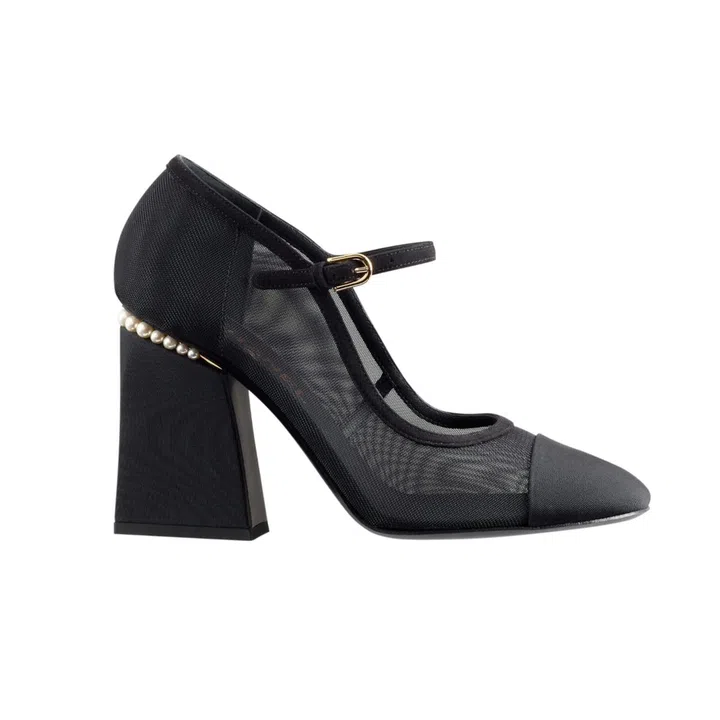 Each pair is handcrafted by artisans that include blockmakers, cutters and stitchers. Mary Janes are a common style seen on the Chanel runway, like the block heeled mesh creation here. The wider heel provides the wearer comfort and added boldness, juxtaposed with the thin string of pearls that wrap the back of the heel.