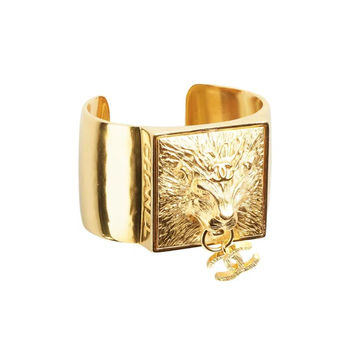 The jewellery house Goossens, which is famed for drawing influences from Ancient Egypt and Byzantium, has been crafting detailed costume jewellery pieces for Chanel since the mid-20th century. Founder Robert Goossens' baroque style that combined raw elements and juxtaposing materials was what caught the eye of Gabrielle Chanel. The lion face relief on the cuff holds a powerful significance to Mademoiselle Chanel: Not only does it signify her astrological sign (she's a Leo), it's also the emblem of her favourite city, Venice. Her love for the animal runs deep; incorporating its imagery into buttons, handbag clasps, costume jewellery and even decorating her 31 rue Cambon apartment with lion figures.