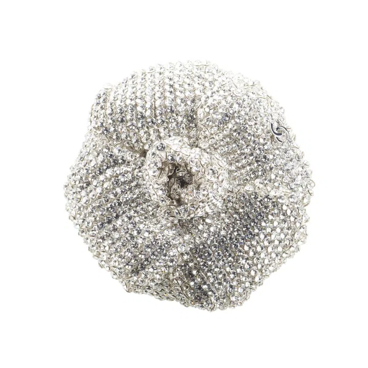 Produced by the 50-man Montex embroidery atelier, this diamante camellia brooch is festooned in glittery crystal strass. The artisans spent 15 hours to produce a single brooch, sewing together close to 3,000 crystals onto the petals by hand.