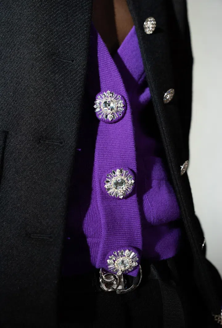 The influence of this new home spilled into the designs of the clothes. Inspired by the "threads of white concrete" that adorn the facade of Le19M, Viard decorated pockets and bags with crisscrossing white lines, while embroidery, such as the silver sequin needlework by Montex, riffed on the building's gleaming glass exteriors.