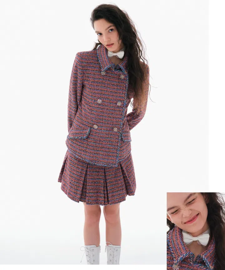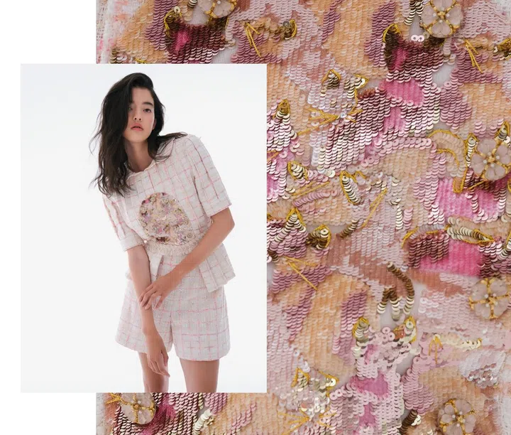 For a start, prepare for the prettiest majorette march as Virginie Viard borrows from the uniforms of female parade performers. The pleated jacket in this two-piece look made from lightweight, pink-and-beige chequered tweed was inspired by the costumes of baton twirlers. Its sides are skilfully slit so that its neat folds – each created using fabric that is three times its volume – sit well over the boxy shorts and let the wearer easily slide her hands into the short pockets. Adding to its playfulness is a sequinned plastron embroidered by Montex – one of the 12 craftsmen ateliers Chanel owns – that holds more than meets the eye: Can you make out its many kitten motifs in various shades of pink?