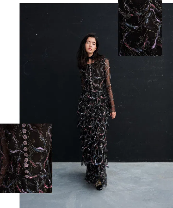 The delicately frothy volume of this svelte, long-sleeved lace dress comes not only from its ultra-light flounces, but also a layer of tulle underneath. Its nod to the beauty of the wild: hand-painted, marbled motifs of branches in shades of pink, purple and blue – all artfully intertwined to echo Chanel's double C logo – and jewelled buttons in the form of flowers by Maison Desrues.