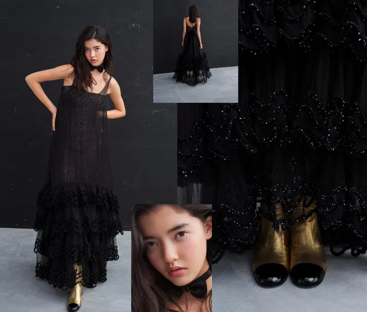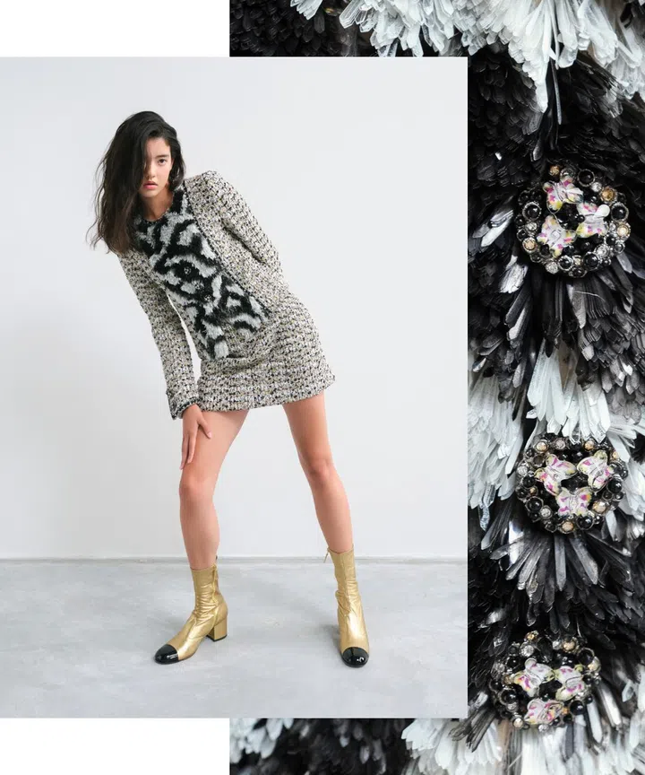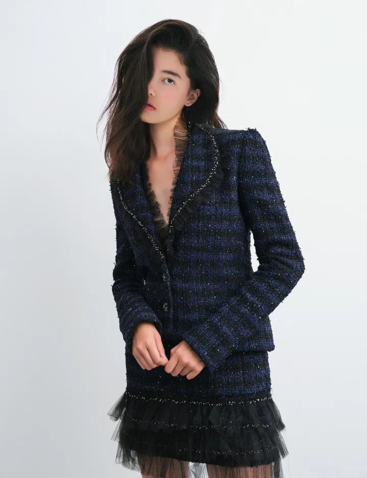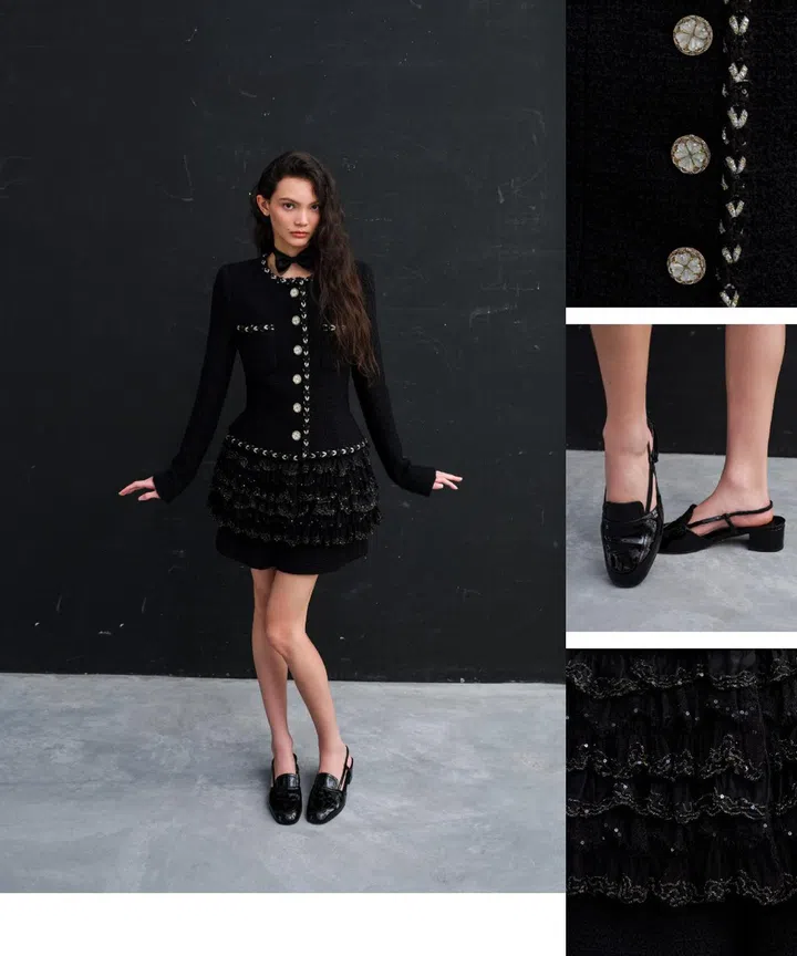 On the other hand, a black-and-midnight-blue tweed jacket gets an unexpectedly ethereal edge with silver threads and sequins woven into the tweed as well as tulle flounces handcrafted by Paloma – an atelier specialising in working with flou, or delicate fabrics – along the lapels. Three tiers of the same wispy applique that Chanel dubs "illusion tulle" are found on the hem of the matching backless minidress, peeking over rows of tiny black and silver beads that lend a romantic illuminating effect.