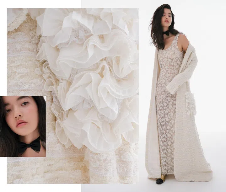 The gossamer-lace-on-organza maxi tank dress alone is breathtaking, but one could say that it’s the accompanying coat that is true wizardry. Inspired by that of a magician’s, the dramatic number is crafted from ecru-coloured tweed by Lesage and anchored by large patch pockets embellished by Lemarie. To create said pockets, artisans cut into strips lace as well as chiffon and satin cut on the straight grain, and arranged them in an alternating sequence. Each ribbon is next held between two sheets of paper, traced out so that it can be stitched discreetly to create a bouillonnés – or frothing – effect, and given a delicate bourdon stitch (aka a rolled hem) before being individually applied to a white organza base. The result: ruffles so lively it's as if every band of fabric is dancing.