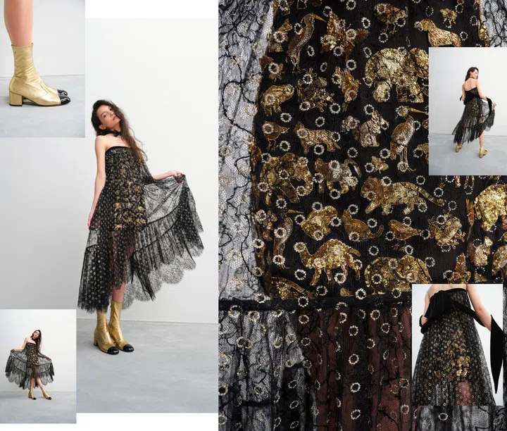 The outer layer of this show-stopping number is composed of lace plumetis (the fabric is woven with raised dots) set against sheer black silk tulle and features a low flounce for extra kick. Peeking out from underneath it is a golden menagerie embroidered in relief onto an organza-lined silk tulle sheath by Montex – whimsical and utterly stunning.