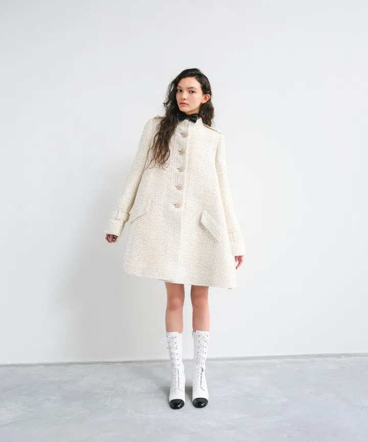 Sequinned tweed paletot coat with jewelled buttons, satin and silk tulle bow tie, and leather lace-up boots with patent leather toe caps, Chanel