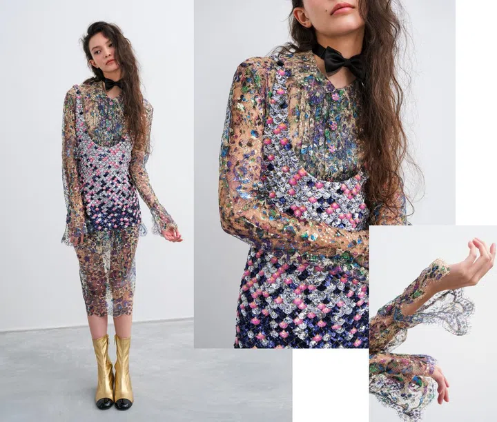Possibly the most exquisite take on mermaidcore, this three-piece outfit features a pleated blouse and pencil skirt made of iridescent, multicoloured floral lace set against flesh-coloured silk tulle for a daring play with transparency. The long sleeves of the blouse open at the cuff, accentuating the garment’s lightness and femininity. Completing the look: a tank-top-style, ecru-coloured organza tunic embroidered with scales in shades of purple, pink, orange, gold and silver – look at this trove; treasures untold indeed.