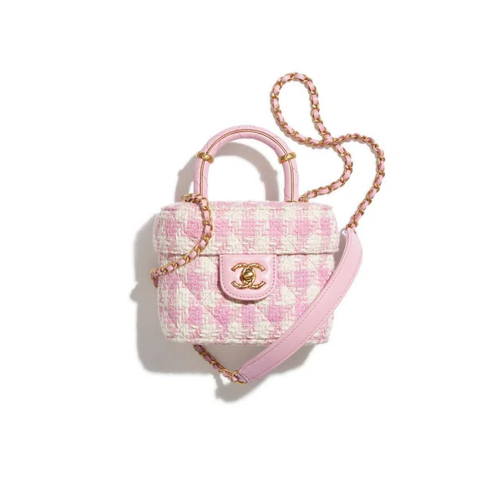 We are wigging out over how cute this petite vanity case draped in pastel pink houndstooth tweed. Note the strip of leather on the strap to make carrying the bag more comfortable.