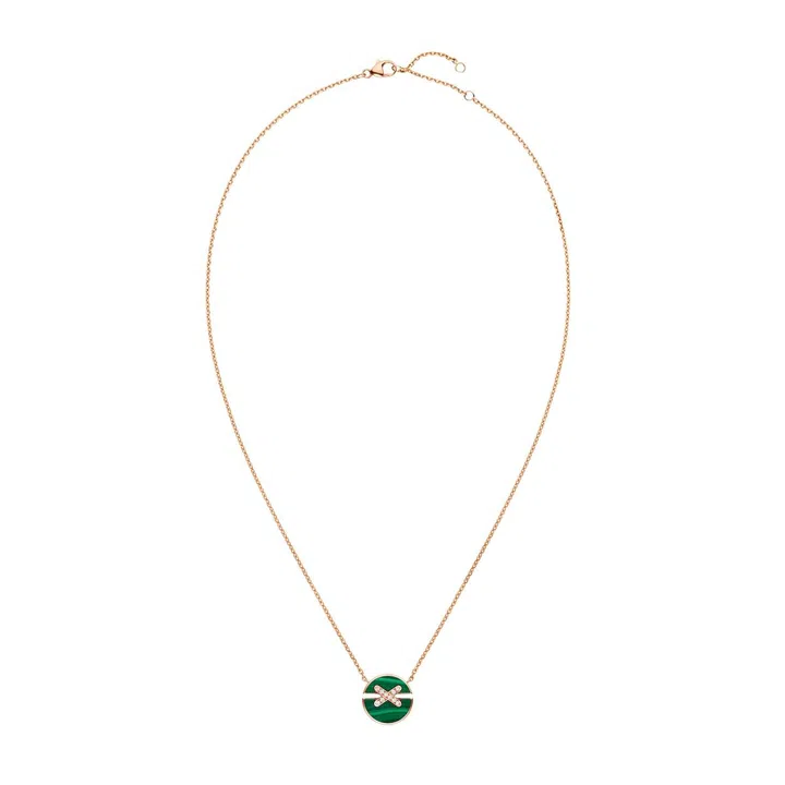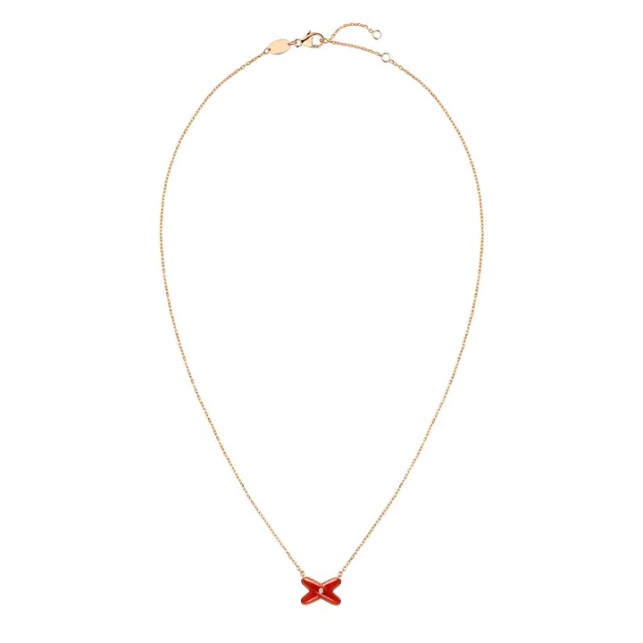 Recognised for curvilinear X-shaped pendants and medallions made of two asymmetrical semi-circles respectively, the two lines are joined by a total of 10 new pieces that are adorned with coloured stones in the form of red carnelian, green malachite and the inky black onyx.