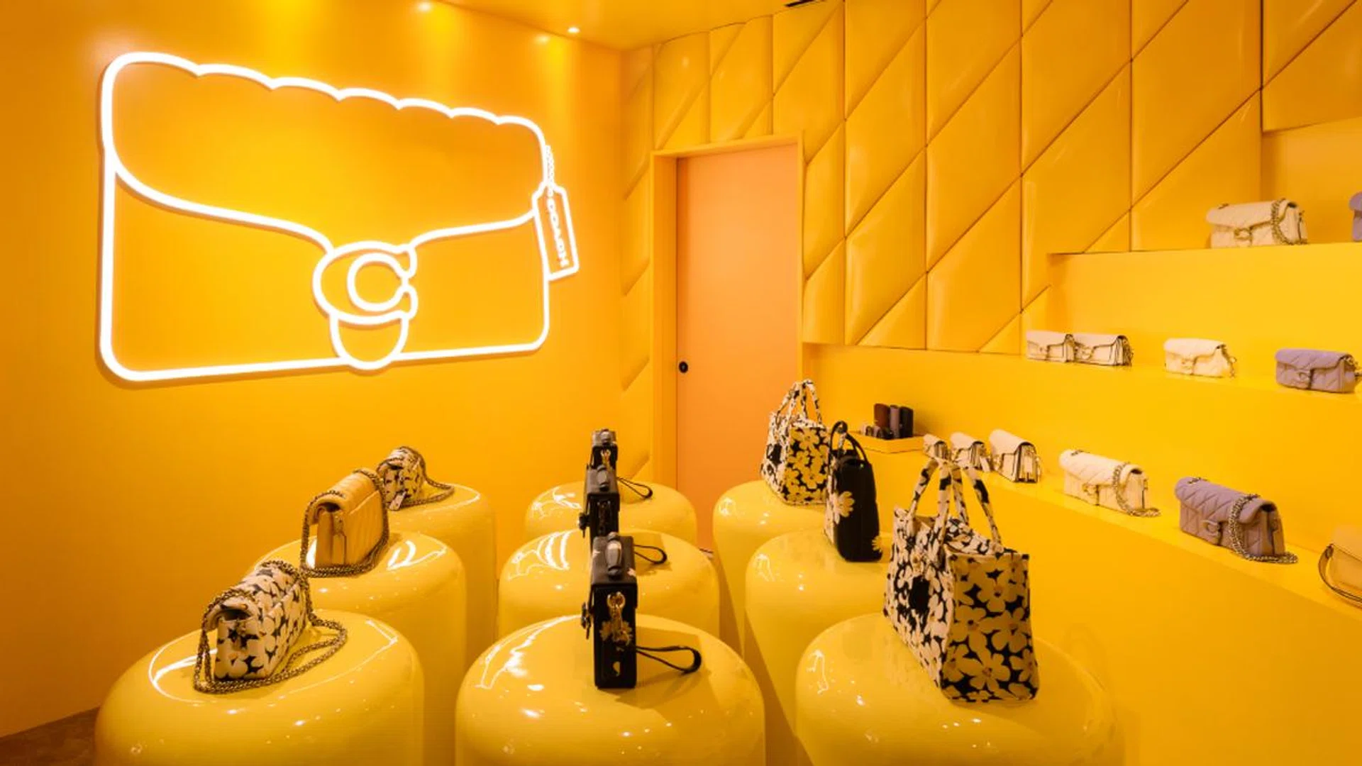 The Coach Tabby Shop is splashed in canary yellow, with the walls bedecked in an oversized quilted motif that is often seen on the namesake bag designs.