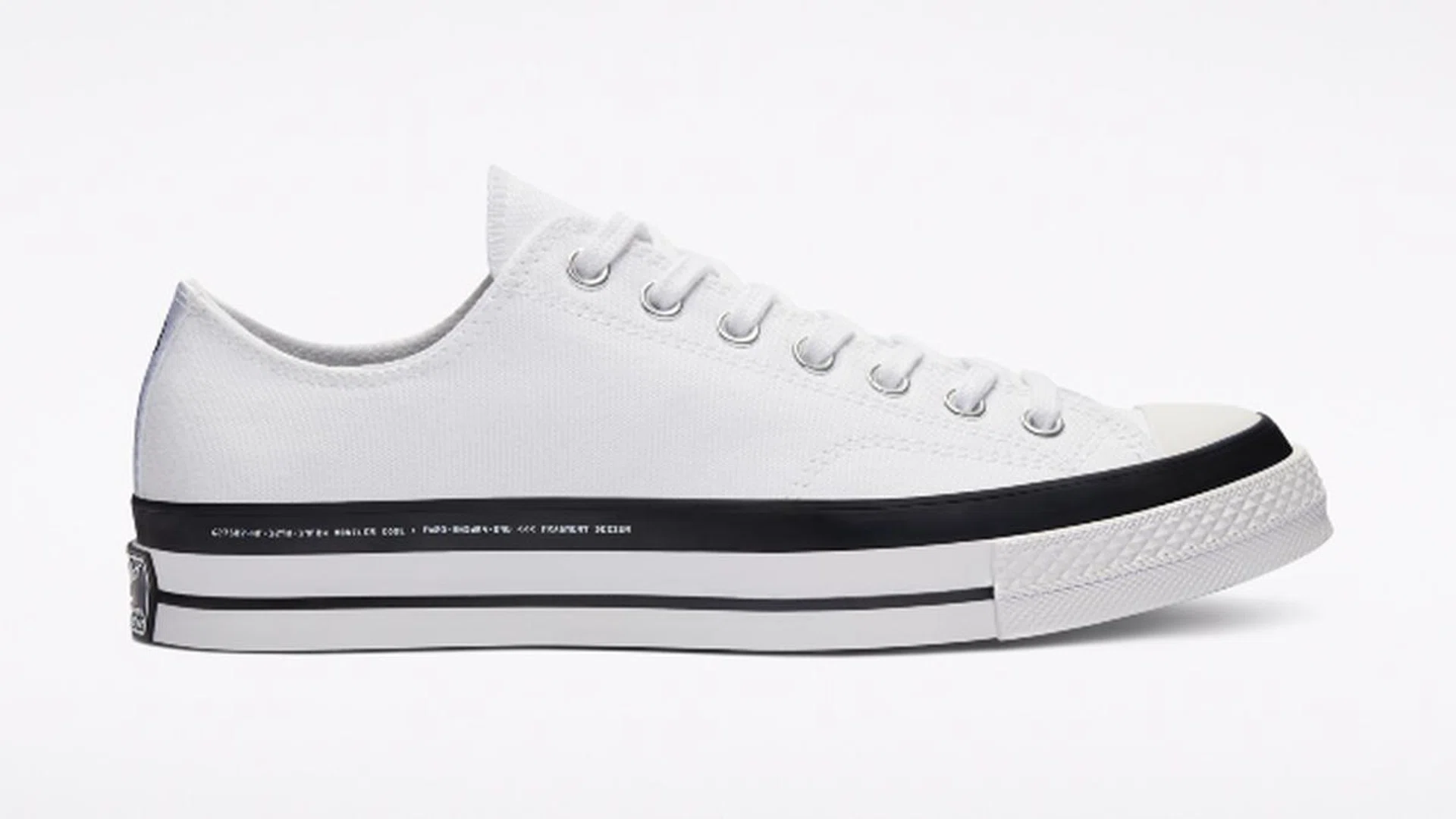 Dubbed the Converse X Moncler X Fragment Chuck 70, the model comes in two colourways – black and white – in a seemingly minimalist package. Take a closer look and you'll notice subtle details such as stitched rectangles on the side and the upper rim painted black and emblazoned with text on both models.