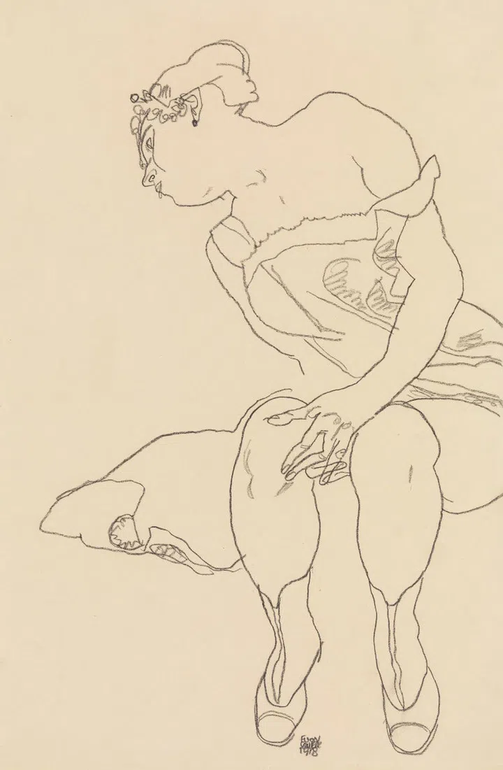 Seated Woman in Corset and Boots (1918), Egon Schiele, crayon on paper. Bequest of Scofield Thayer, 1982. The Metropolitan Museum of Art