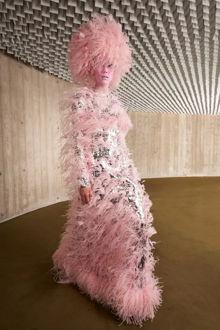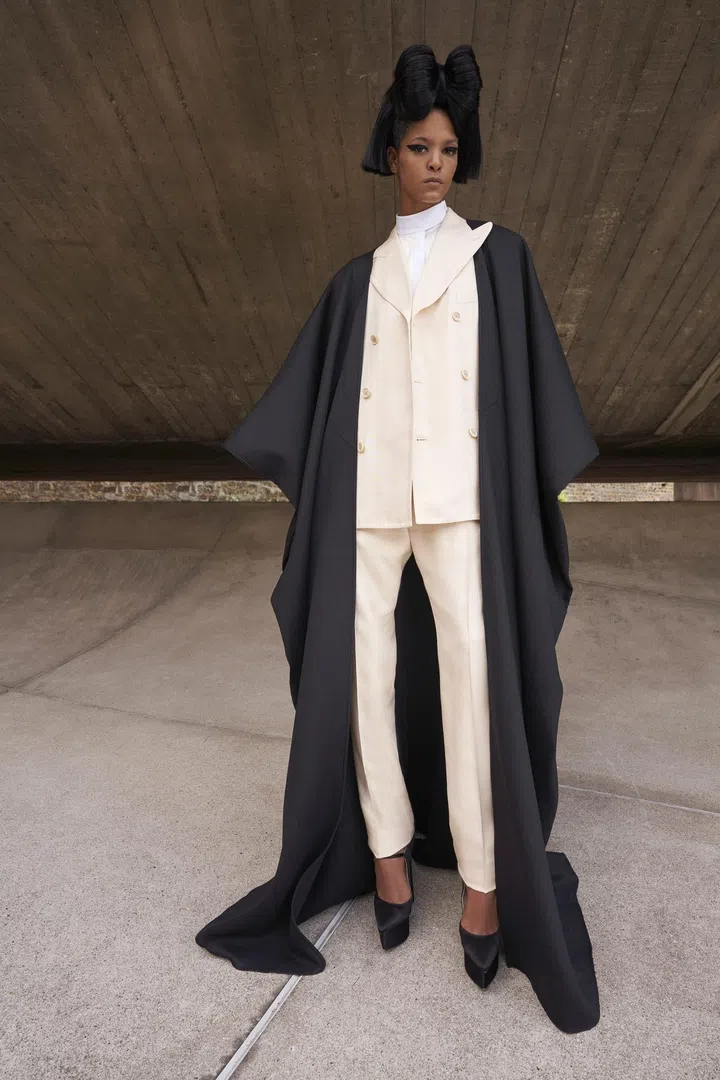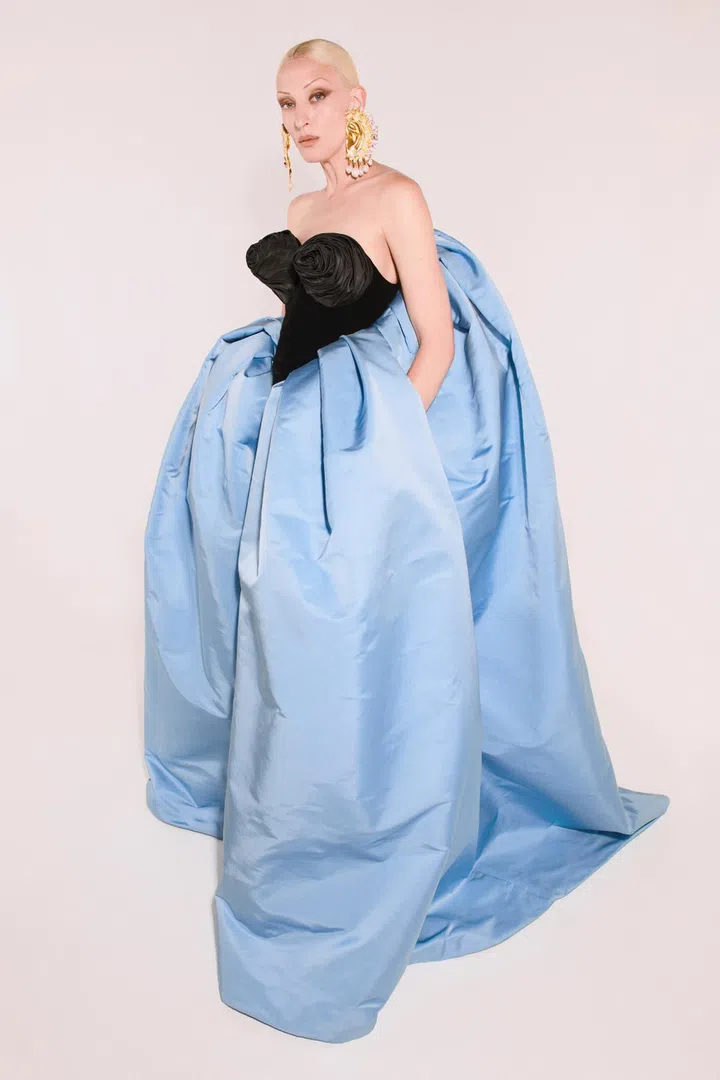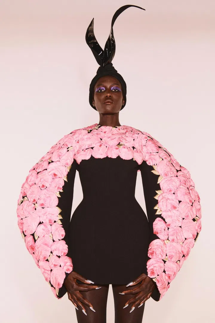 Titled 'Matador', the sculptural silhouettes referenced plenty of archival designs like a dress with curved sleeves embroidered with silk roses which is an ode to a Jean Jean Cocteau x Schiaparelli original from 1937.