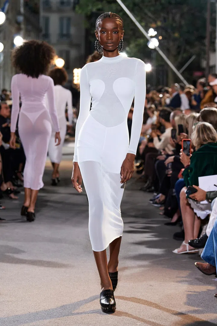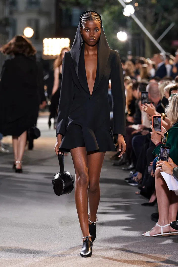 Consider the slinky dresses and tube dresses with their seams outlining the curves of the bosom and hips which alluded to Alaia's 'King of Cling' status. Or how about the hooded tailoring (a vestige of the 1984 archives) and the perforated corset belts that paid homage to the founder's Tunisian roots? Alaia's signature grommet hardware? These were swapped with metal bobbles for something cheeky fun.