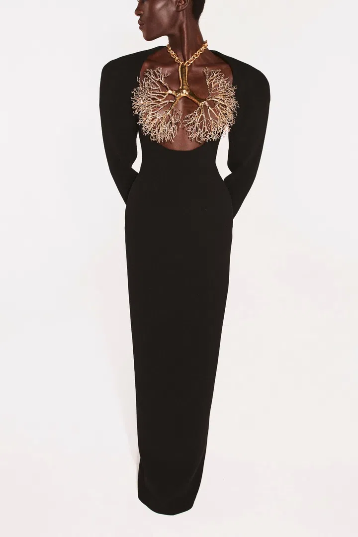 Over at Schiaparelli, creative director Daniel Roseberry continued his beautiful love letter to Elsa while toying with his predilection for human anatomy (cue the black column dress embellished with a necklace of human lungs drenched in gold).