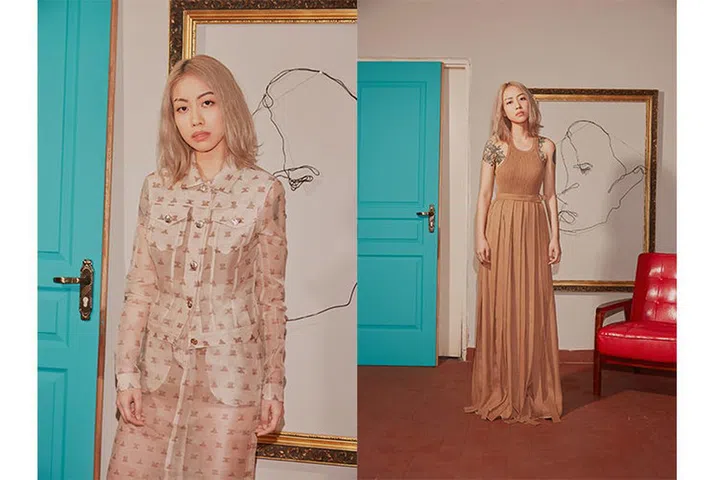 (From left) Silk organza trench coat, and leather ankle-strap sandals. Earrings, Soh’s own. Wool and tulle jumper, silk skirt, and leather ankle-strap sandals