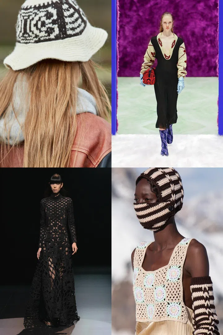 Clockwise from left: Crochet designs seen on the Fall/Winter 2021 runways of Celine, Prada, Miu Miu and Valentino.