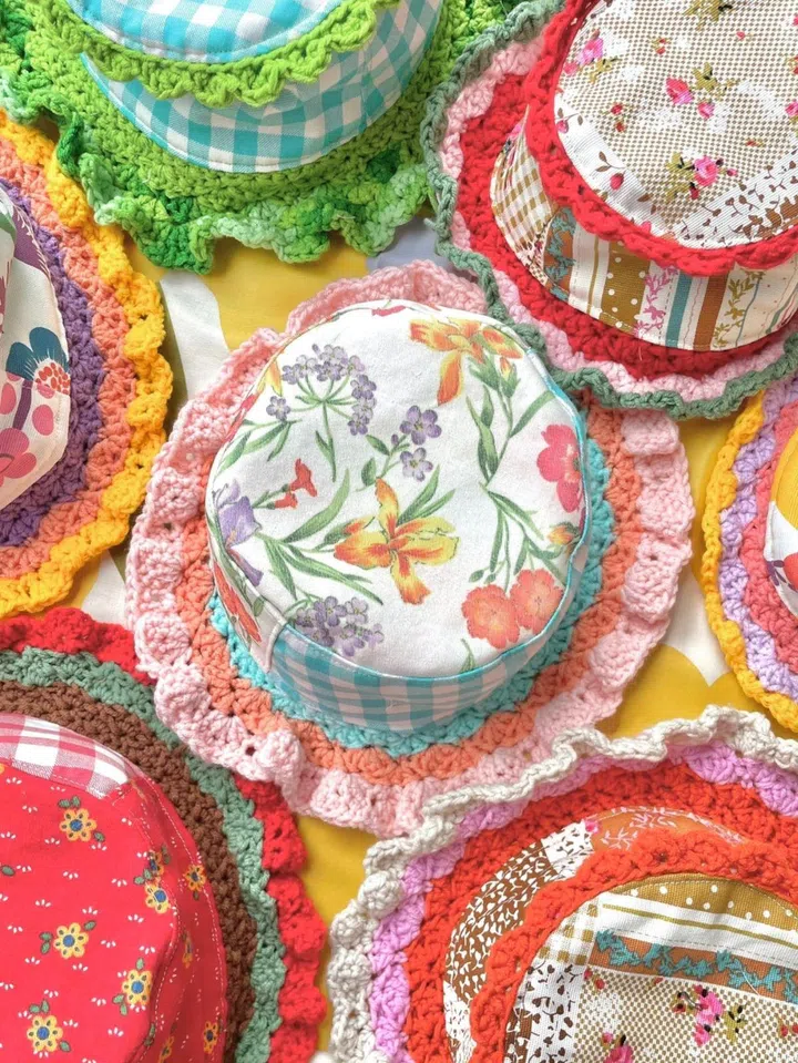 Miyuki: “I wanted to do something different for our crochet hats and because I was already trying out different designs of fabric hats, I thought why not just combine the two materials together. It was a really simple and spontaneous idea, but I remember feeling so excited when I first put fabric and crochet together.”