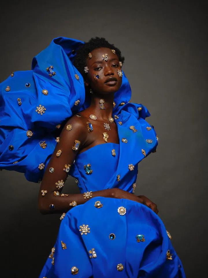 Drawing inspiration from the likes of ’80s pop culture, Roseberry introduces a flirty sense of glamour distinctive of that era to the Schiaparelli aesthetic. Besides its brash ultramarine hue, this sculptural number with Surrealist-inspired rhinestone embellishments, for example, features an asymmetrical, thigh-revealing hemline typical of cocktail gowns from that decade.
