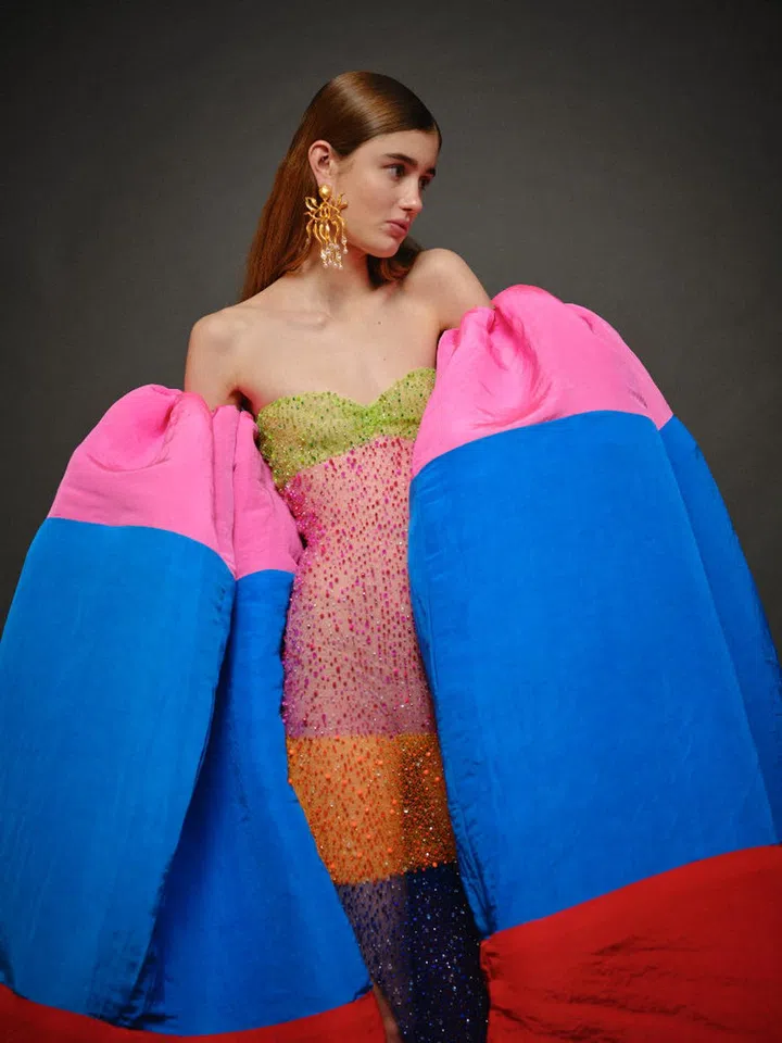 Roseberry highlights the duality of Elsa Schiaparelli – go-getting designer in her studio and hostess of Paris’ most incredible Surrealist parties at home – in the brand’s S/S ’20 couture collection, like a dramatic gowb with exuberant volume and broad, almost sporty multi-coloured stripes.