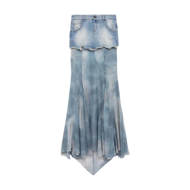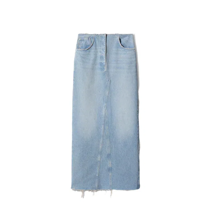 Rewind to a year ago and mini skirts were one of the most talked about fashion items of Spring/Summer 2022. Most notably, Miu Miu's pleated micro mini skirts were red hot and seen on the hips of some of fashion's biggest names like Hunter Schafer, Emily Ratajkowski and Dua Lipa, as well as dudes like Manu Rios and Conan Gray. But a new contender is aiming for the top spot occupied by the itty-bitty skirt this season. Enter the denim maxi skirt trend which is sweeping retail floors and street style.