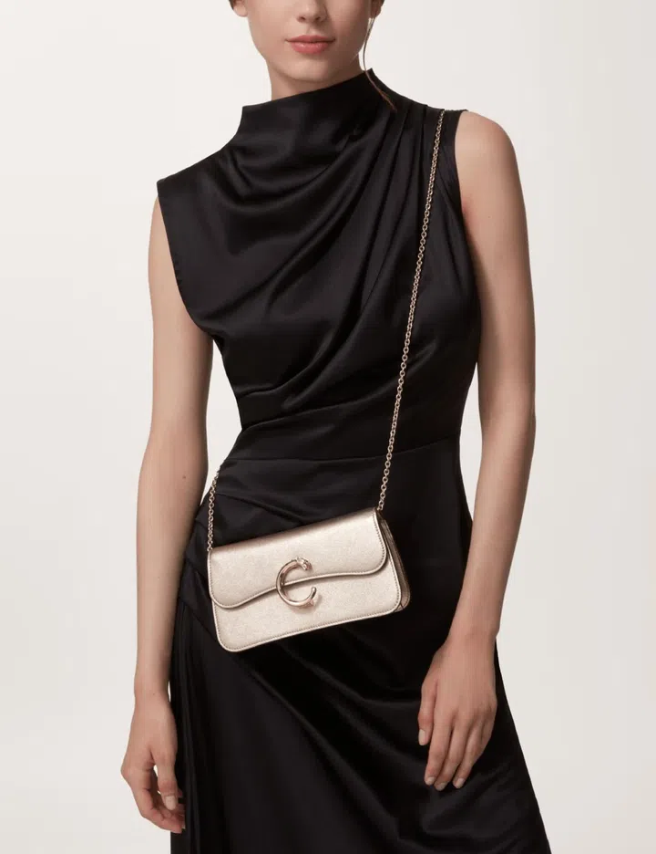 The French luxury maison has been on a streak expanding its leather goods family, particularly that of the Panthere de Cartier collection. Distinguished by a bejewelled clasp in varying forms of a panther’s head (the one here is shaped like a slick “C”), the line welcomes a party-ready addition with a dinky, structured shape and fun finishes such as golden metallic calfskin or all-over black sequins. Available in S or mini (the one pictured here), it can be carried crossbody on its chain shoulder strap or as a clutch.