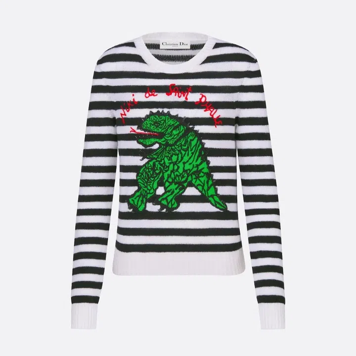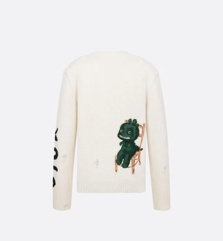 The classic off-white wool and cashmere jersey sweater flaunts a Dior embroidery on its left sleeve, featuring the signature cheeky green monster motif from the Otani Workshop capsule on the back. Despite being seated, it undeniably exudes an air of mischief.