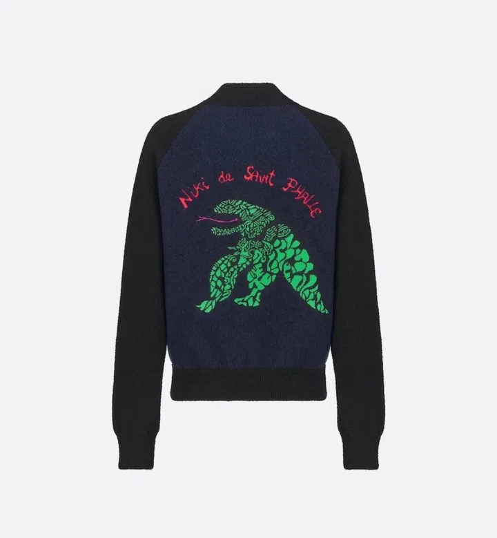 We can't forget about this bomber jacket, featuring Niki de Saint Phalle’s Tu es mon dragon monster roaring loudly on the back. Crafted in navy blue technical virgin wool knit, the bomber jacket is sure to be a comfy choice for a rainy day.