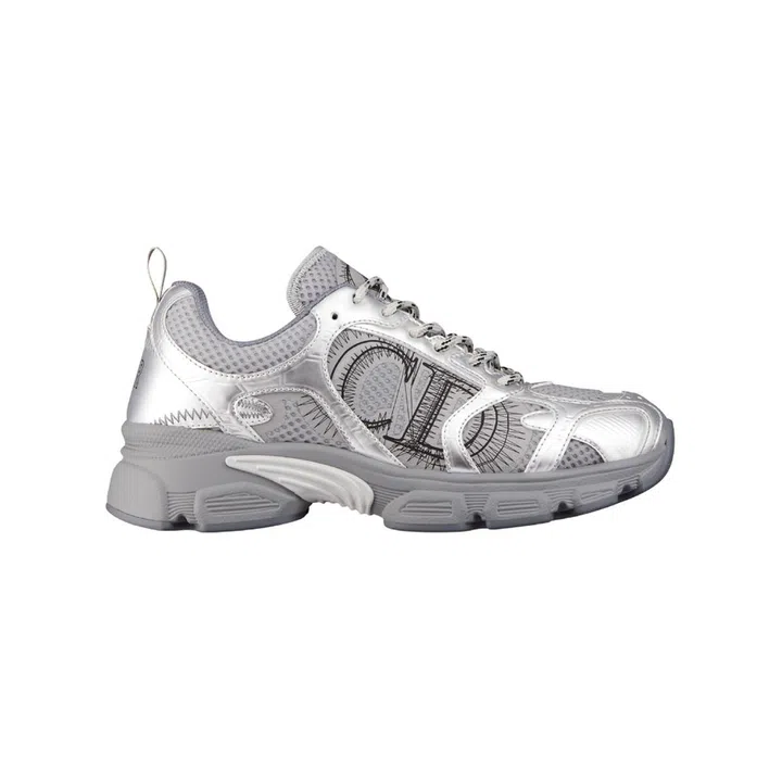 The Dior Chrono sneakers are crafted from silver-tone laminated leather-effect panels. Their distinctive features include accentuated details in the design, such as a CD signature on the sides, a star patch on the tongue, and a Dior signature at the rear.