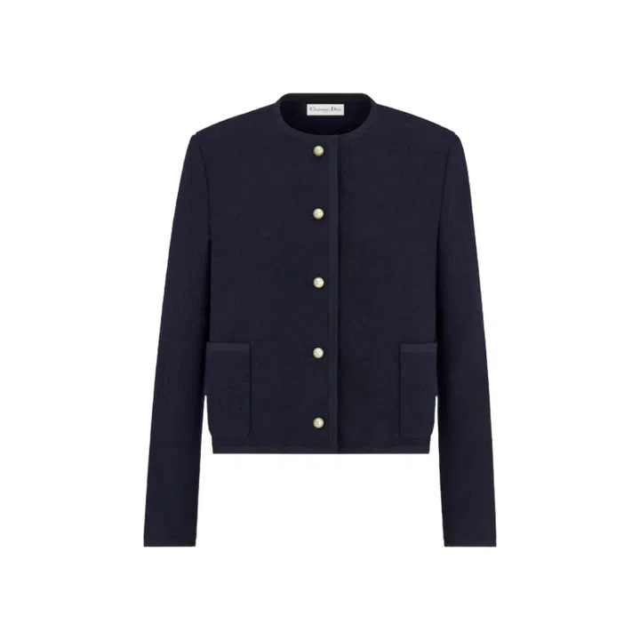 This jacket is made from navy blue virgin wool and cotton bouclé. It has a cropped regular fit and features Dior Tribales buttons with CD signature resin pearls along the jacket.