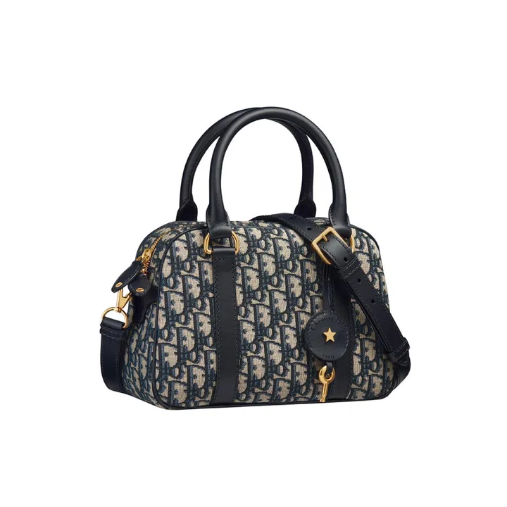 This piece is crafted from blue Dior Oblique jacquard and features a leather key holder embellished with a gold-finish star and the Christian Dior Paris signature. The key attached to the key holder opens the zipper padlock, revealing a bag compartment accommodating essential items.