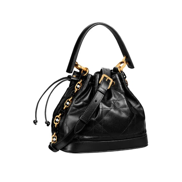The Dior Jolie bucket bag is crafted from black calfskin and features Macrocannage stitching around the bag. Its distinctive feature is the drawstring closure, which also creates a spacious interior. The bag is versatile, with multiple ways to wear it, including a removable black leather top handle and an adjustable chain.