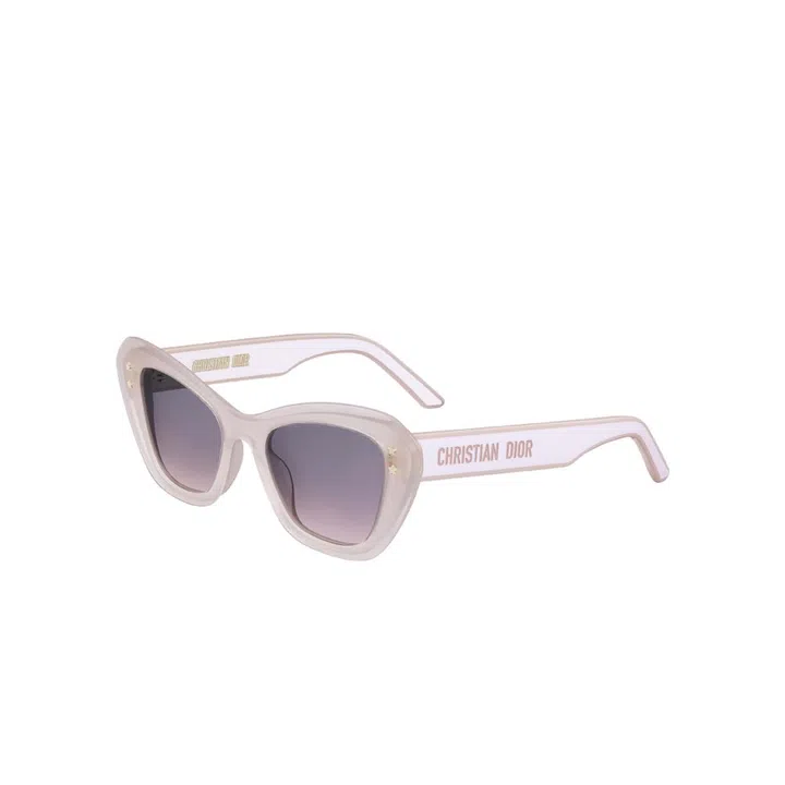 The DiorPacific B3U sunglasses feature a butterfly-like design and are made from transparent pink acetate. The sunglasses also have gold-finish star details and gradient purple-to-pink lenses.