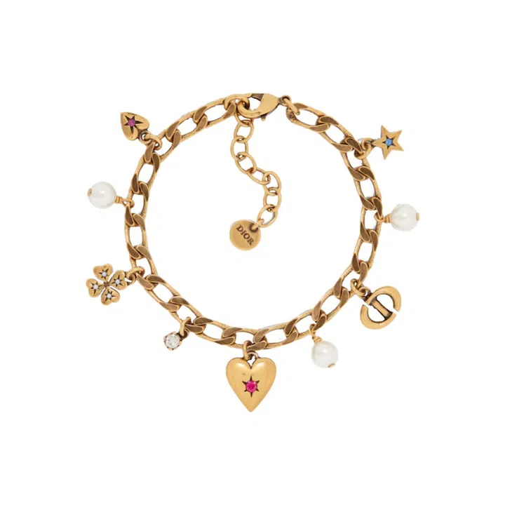 The Dior Lucky Charms bracelet is adorned with various miniature charms, creating a charming, vintage-like piece of jewellery. The charms include white crystal and resin pearls, a clover with small pearls, a heart with a pink crystal, and a star with a blue crystal.