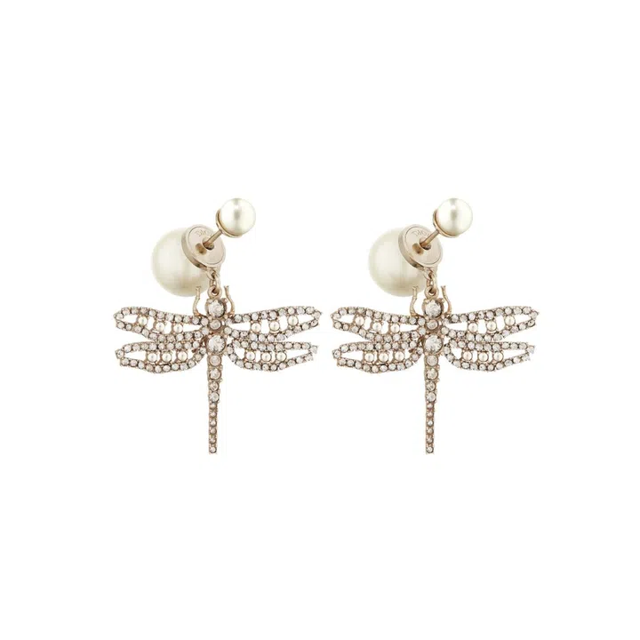 These dragonfly earrings are the Dior Tribales earrings, inspired by dragonflies flying in a star-filled sky. They are made with Hallmark resin pearl studs and silver-tone crystals, creating delicate and intricate pieces perfect for making a statement.