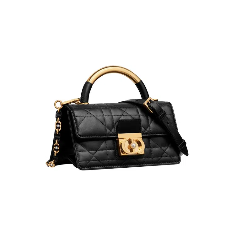 This piece is distinguished by its top handle, crafted from antique gold-finish metal and engraved with the Christian Dior Paris signature. The flap features a CD clasp, with a resin pearl in the centre. Although it is a mini bag, it has two compartments and a slip pocket to accommodate everything you need for the day.