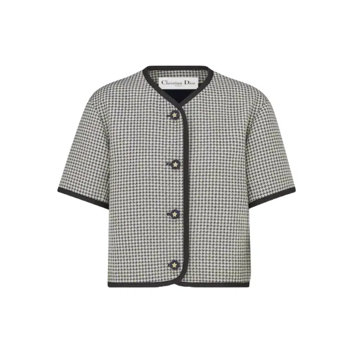This short-sleeved jacket features a blue and white cotton-blend jacquard pattern. It has a collarless, cropped silhouette and is designed with Christian Dior Paris buttons with star details and grosgrain trim.