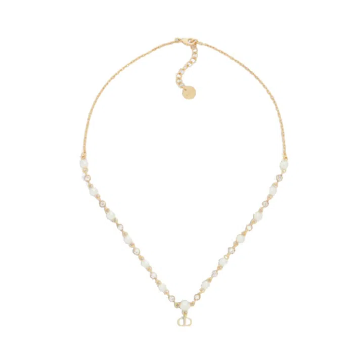 The Petit CD Treasure necklace features a gold-finish metal chain adorned with white resin pearls and silver-tone crystals. The centre of the necklace displays the CD signature. This piece can complete any look with its simple yet stylish design.